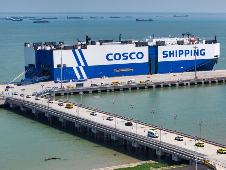 江蘇太倉港,“禮諾運輸”號貨輪載著2600余輛汽車奔赴歐洲,“玉衡先鋒”號貨輪正將3600多輛國產新車運往東南亞。