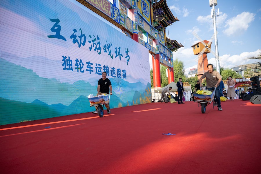 現(xiàn)場還設置了文明市集,涵蓋農(nóng)產(chǎn)品展銷、文明風尚、金融與農(nóng)業(yè)知識普及等40余個項目,吸引村民和游客積極參與。獨輪車運糧賽、挑糧接力賽、扇風趕雞等互動環(huán)節(jié)更是把文明理念與農(nóng)耕趣味巧妙結(jié)合,讓觀眾在歡笑中感悟移風易俗的意義。