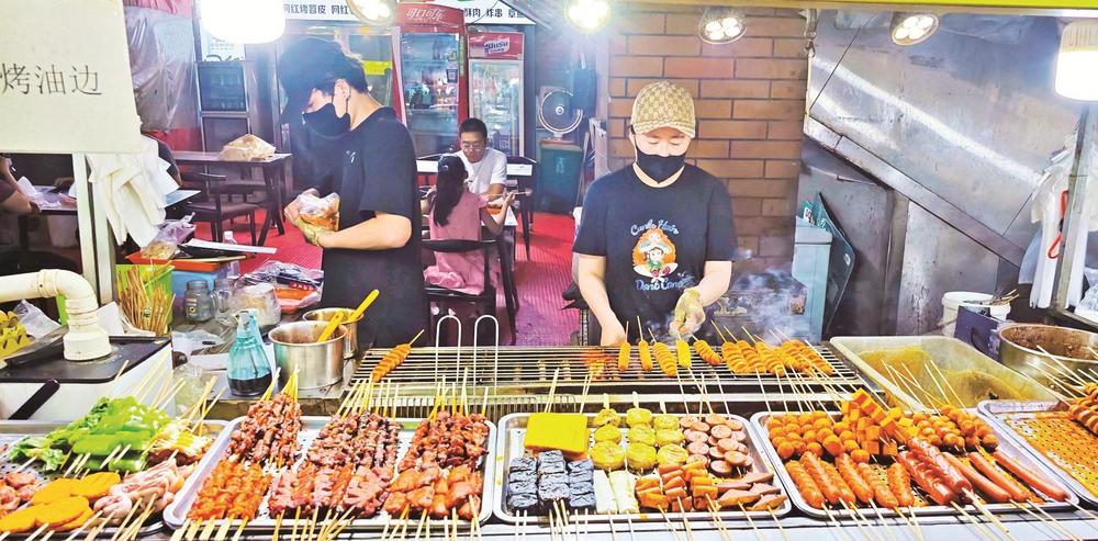 炭火上的羊肉串嗞嗞作響,油脂滴落,迸出金色火花,散發(fā)出誘人的香氣??腿藝谒芰闲∽琅裕掷锬弥?zhèn)啤酒,碰杯傳出清脆的響聲……這里沒有高檔餐廳的拘謹,只有朋友相聚的歡樂和大口吃肉的暢快。大學(xué)生徐瑞虹放暑假后,經(jīng)常和朋友來夜市消暑?!拔覀儙讉€沒事就來萬達金街轉(zhuǎn)一轉(zhuǎn),天太熱了,待在家里也悶,而且夜市里的這些小吃我們都比較喜歡,沒事幾個人喝幾瓶啤酒,聊一聊天,感覺還是很愜意的?!睂τ谀贻p人來說,夜市不僅是美食的聚集地,更是釋放壓力、享受生活的好去處。在這里,他們可以暫時拋開煩惱,盡情享受美食帶來的快樂。