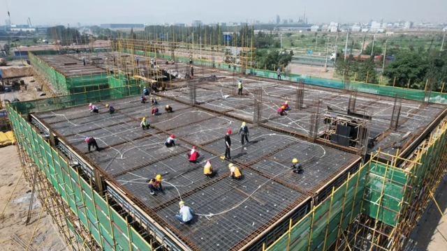 “目前,項目正在進行基礎設施施工,辦公樓已完成1層封頂,1號車間正在進行主體結構的鋼管架的搭設和模板制作,外網工程和2號、3號車間基礎施工也在順利推進?!表椖渴┕挝回撠熑送跣闵礁嬖V記者,該項目計劃今年8月底完成辦公樓、綜合服務樓主體施工,9月中旬完成3個車間主體施工。