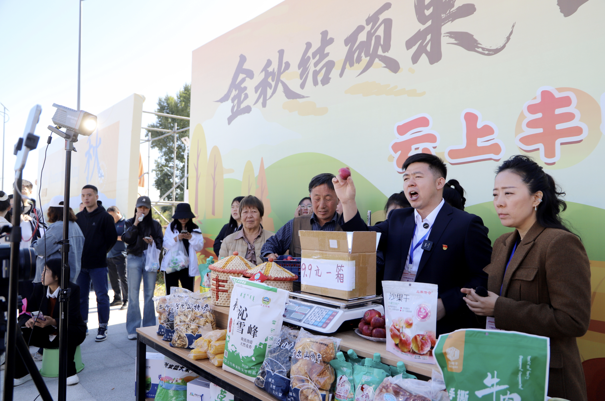 “這都是我們本地的農(nóng)產(chǎn)品,我現(xiàn)在正在豐收節(jié)的現(xiàn)場,各位朋友抓緊下單,興安盟產(chǎn)品不會讓你失望!”活動現(xiàn)場,烏蘭浩特市義勒力特鎮(zhèn)西包達(dá)力干嘎查駐村干部王曉龍將直播間設(shè)在現(xiàn)場,與村民在豐收的熱情氛圍中一起賣力地推介家鄉(xiāng)好物。