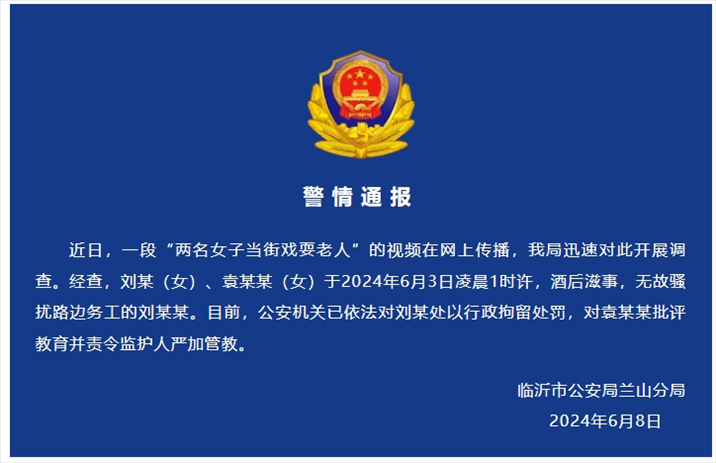央視網(wǎng)消息:6月8日,臨沂蘭山公安發(fā)布警情通報:近日,一段“兩名女子當(dāng)街戲耍老人”的視頻在網(wǎng)上傳播,我局迅速對此開展調(diào)查。經(jīng)查,劉某(女)、袁某某(女)于2024年6月3日凌晨1時許,酒后滋事,無故騷擾路邊務(wù)工的劉某某。目前,公安機關(guān)已依法對劉某處以行政拘留處罰,對袁某某批評教育并責(zé)令監(jiān)護人嚴(yán)加管教。