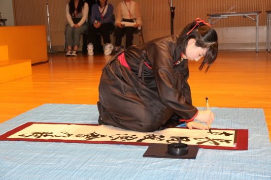 6月15日,在日本東京,選手在“漢語(yǔ)橋”世界中學(xué)生中文比賽日本賽區(qū)決賽中展示中文書(shū)法。記者 胡曉格 攝