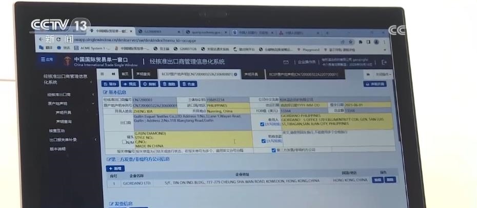 當(dāng)日,廣西桂林一家紡織企業(yè)通過國際貿(mào)易“單一窗口”申報(bào),為一批出口到菲律賓的貨物自主出具了廣西首份RCEP原產(chǎn)地聲明,貨值約9萬元,在菲律賓享受關(guān)稅優(yōu)惠約1.3萬元。2022年,這家紡織企業(yè)作為海關(guān)高級認(rèn)證企業(yè),率先認(rèn)證成為廣西紡織領(lǐng)域首家“經(jīng)核準(zhǔn)出口商”。