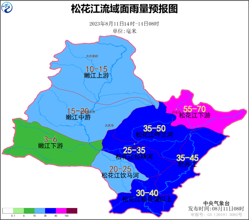 松花江流域面雨量預(yù)報(bào):11日下午至13日,松花江流域中東部面雨量20~55毫米,其中松花江下游面雨量55~70毫米;鴨綠江、圖們江、綏芬河子流域面雨量40~45毫米。