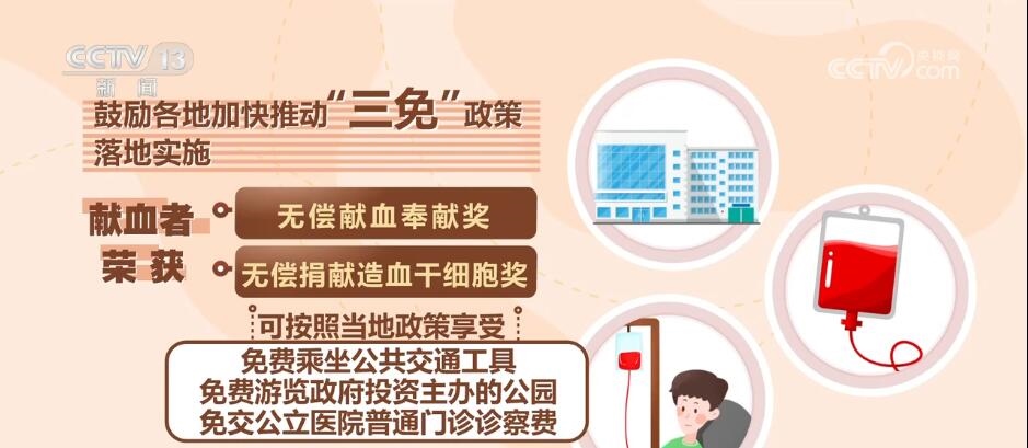 鼓勵(lì)各地加快推動(dòng)“三免”政策落地實(shí)施,榮獲無(wú)償獻(xiàn)血奉獻(xiàn)獎(jiǎng)、無(wú)償捐獻(xiàn)造血干細(xì)胞獎(jiǎng)的獻(xiàn)血者可按照當(dāng)?shù)卣呦硎苊赓M(fèi)乘坐公共交通工具、免費(fèi)游覽政府投資主辦的公園和免交公立醫(yī)院普通門診診察費(fèi)。