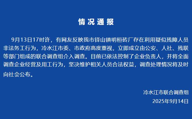 據(jù)“冷水江新聞”微信公眾號消息,9月13日17時許,有網(wǎng)友反映湖南冷水江市鐸山鎮(zhèn)明桓磚廠存在利用疑似殘障人員非法務(wù)工行為,冷水江市委、市政府高度重視,立即成立由公安、人社、殘聯(lián)等部門組成的聯(lián)合調(diào)查組介入調(diào)查。目前已依法控制了企業(yè)負責人,并將全面調(diào)查企業(yè)經(jīng)營及用工行為,堅決維護相關(guān)人員合法權(quán)益,調(diào)查處理情況將及時向社會公布。