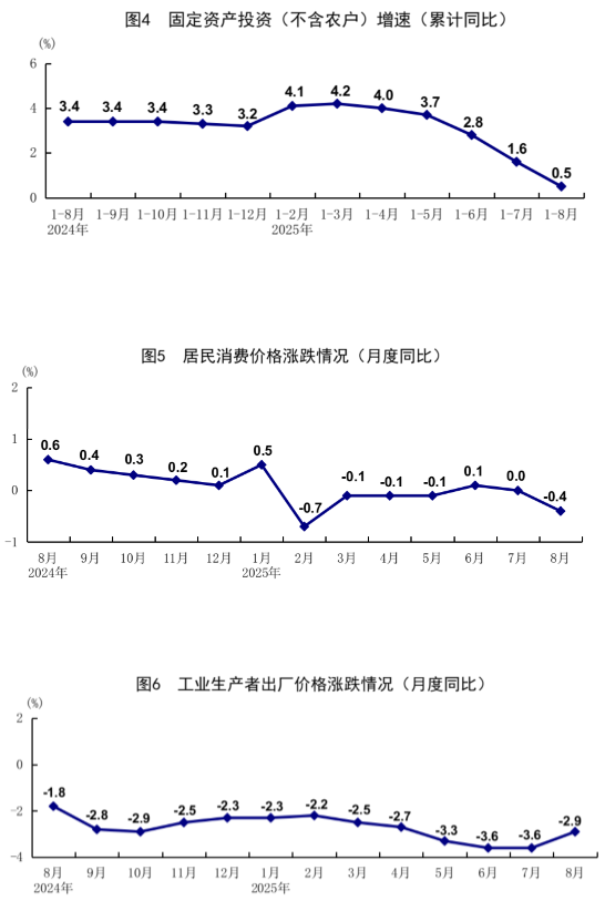 8月份,全國(guó)工業(yè)生產(chǎn)者出廠價(jià)格同比下降2.9%,降幅比上月收窄0.7個(gè)百分點(diǎn),環(huán)比持平;全國(guó)工業(yè)生產(chǎn)者購(gòu)進(jìn)價(jià)格同比下降4.0%,降幅收窄0.5個(gè)百分點(diǎn),環(huán)比持平。1—8月份,全國(guó)工業(yè)生產(chǎn)者出廠價(jià)格和購(gòu)進(jìn)價(jià)格同比分別下降2.9%、3.3%。