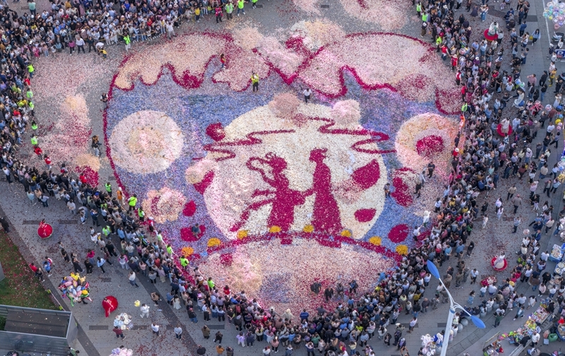8月29日七夕節(jié),人們?cè)谠颇鲜±ッ魇袝x寧區(qū)觀看用玫瑰花瓣鋪就的巨幅圖景《云間鵲橋·花雨鋪路》(無(wú)人機(jī)照片)。