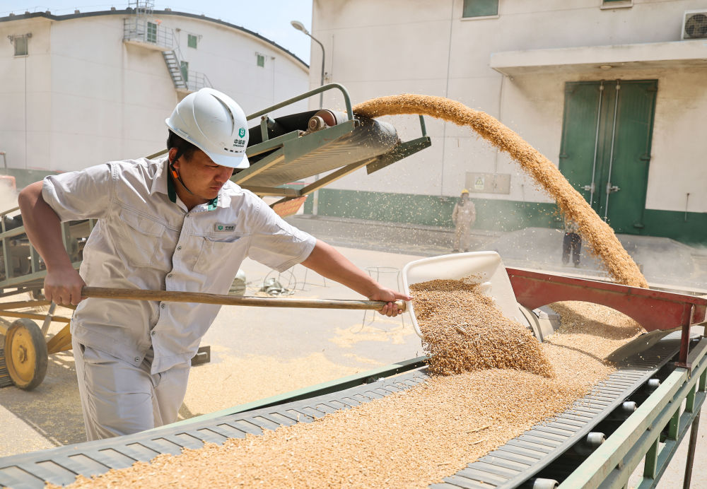 在江蘇連云港市連云區(qū)的中央儲(chǔ)備糧連云港直屬庫糧食收購作業(yè)區(qū),工作人員用傳輸機(jī)傳送小麥入庫(2025年6月18日攝)。新華社發(fā)(王健民攝)