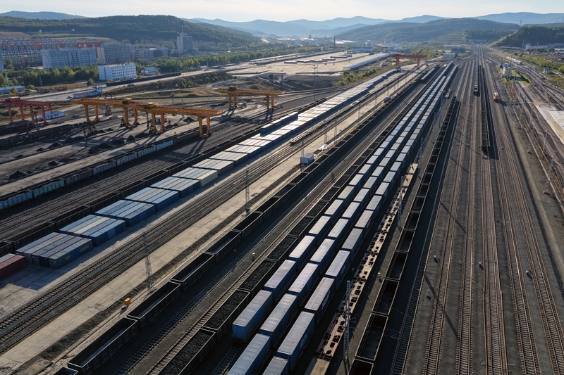 9月27日,滿載貨物的列車(chē)在綏芬河站北場(chǎng)進(jìn)行換裝作業(yè)(無(wú)人機(jī)照片)。