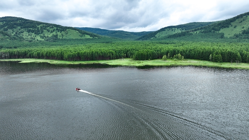 7月5日,游客在內(nèi)蒙古阿爾山國家森林公園烏蘇浪子湖景區(qū)乘船游玩(無人機(jī)照片)。