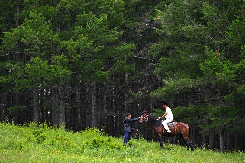 7月5日,游客在內(nèi)蒙古阿爾山國家森林公園體驗(yàn)騎馬。