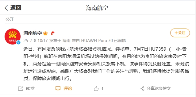 據(jù)海南航空官方微博消息,近日,有網(wǎng)友反映海南航空航班旅客錯(cuò)登機(jī)情況。經(jīng)核查,7月7日HU7359(三亞-貴陽(yáng)-蘭州)航班在貴陽(yáng)龍洞堡機(jī)場(chǎng)過(guò)站保障期間,有目的地為貴陽(yáng)的旅客未及時(shí)下機(jī),乘務(wù)組第一時(shí)間識(shí)別并妥善安排相關(guān)旅客下機(jī)。該事件得到及時(shí)處置,未對(duì)航班運(yùn)行造成影響。