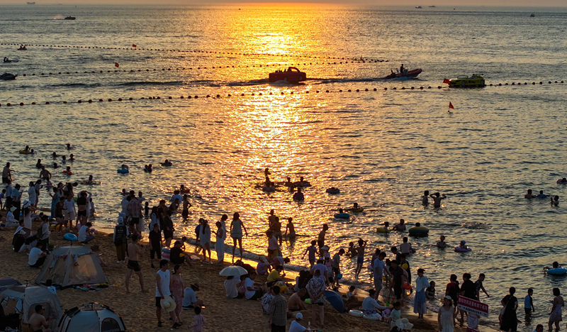 7月5日,游客在山東省威海市國際海水浴場親水消暑(無人機照片)。
