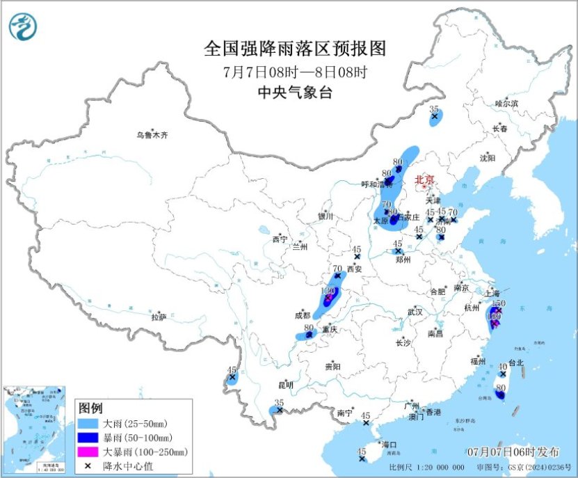 預(yù)計,7月7日08時至8日08時,浙江東部、內(nèi)蒙古中部、山西中北部、河北西北部和西南部、山東北部、河南西北部、陜西西南部、四川東部、云南西南部、臺灣島等地部分地區(qū)有大到暴雨,其中,浙江東部、四川東部等地部分地區(qū)有大暴雨(100~180毫米)。上述部分地區(qū)伴有短時強(qiáng)降水(最大小時降雨量20~50毫米,局地可超過70毫米),局地有雷暴大風(fēng)等強(qiáng)對流天氣。中央氣象臺7月7日06時繼續(xù)發(fā)布暴雨藍(lán)色預(yù)警。