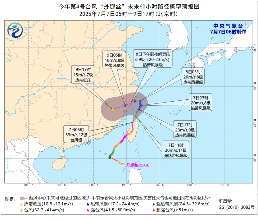 預(yù)計,“丹娜絲”將以每小時15~20公里的速度向北偏東方向移動,強(qiáng)度逐漸減弱;8日早晨起轉(zhuǎn)向西偏南方向移動,逐漸向浙江臺州至福建福州一帶沿??拷⒂?日下午到夜間在上述沿海登陸(8~9級,18~23米/秒,熱帶風(fēng)暴級)。7月7日08時至8日08時,南海東部和西南部的部分海域、臺灣海峽、臺灣以東洋面、巴士海峽、東海南部及釣魚島附近海域、福建沿海、浙江沿海、上海沿海、臺灣島沿海將有6~8級風(fēng),陣風(fēng)9~10級,其中東海西南部、臺灣海峽北部、臺灣以東洋面部分海域風(fēng)力有9~10級,陣風(fēng)11~12級,“丹娜絲”中心經(jīng)過的附近海域風(fēng)力可達(dá)11~12級、陣風(fēng)13~14級。中央氣象臺7月7日06時繼續(xù)發(fā)布臺風(fēng)黃色預(yù)警。