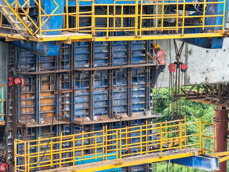 7月8日,工人在成渝中線高鐵土橋樞紐互通雙線特大橋建設現(xiàn)場施工作業(yè)(無人機照片)。