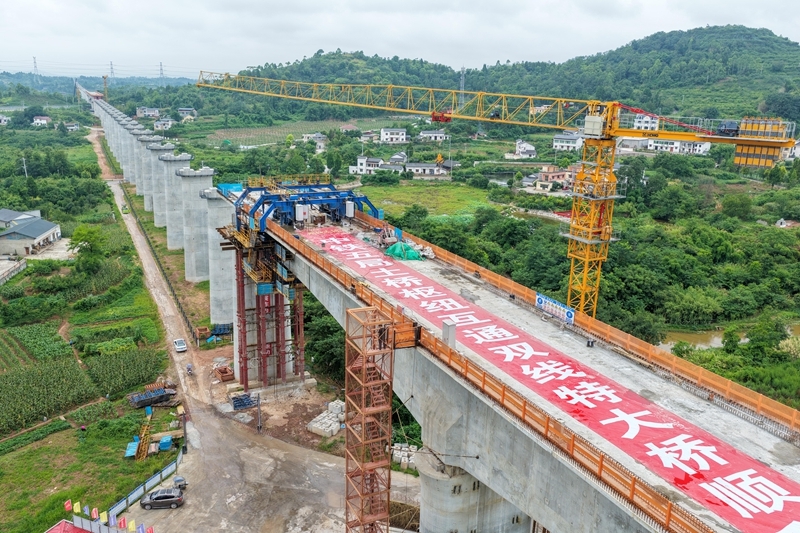 這是7月8日拍攝的成渝中線高鐵土橋樞紐互通雙線特大橋建設現(xiàn)場(無人機照片)。