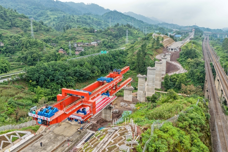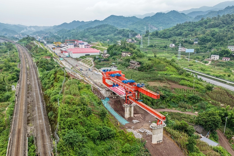 7月10日,在西渝高鐵陳家溝特大橋建設(shè)現(xiàn)場,架梁機(jī)在進(jìn)行首孔箱梁架設(shè)作業(yè)(無人機(jī)照片)。