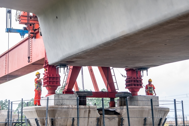 7月10日,在西渝高鐵陳家溝特大橋建設(shè)現(xiàn)場,架梁機(jī)在工人的指揮下進(jìn)行首孔箱梁架設(shè)作業(yè)。
