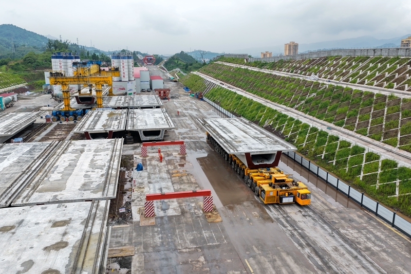 7月10日,在西渝高鐵陳家溝特大橋附近的制梁場,運(yùn)梁機(jī)在進(jìn)行箱梁轉(zhuǎn)運(yùn)作業(yè)。