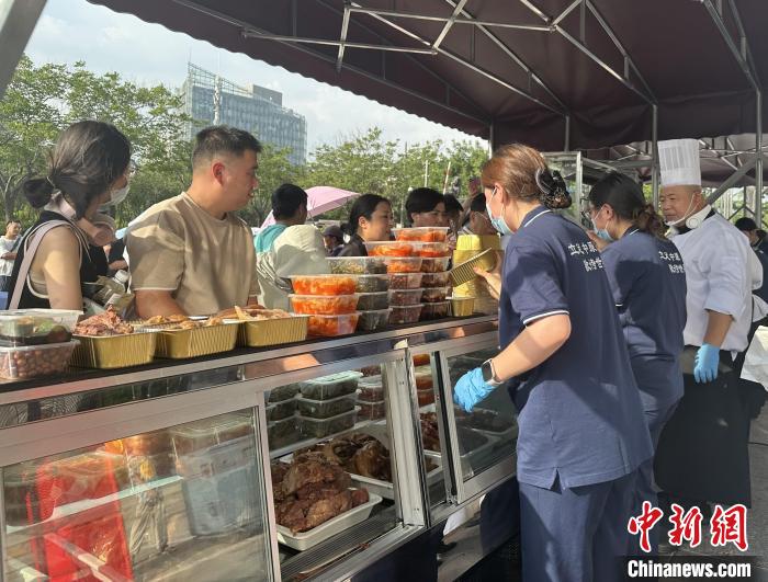 近日傍晚,該酒店外擺攤位推出了熟食、涼菜、主食及高檔特色菜,攤位前排起長隊(duì)。四五十位酒店服務(wù)人員統(tǒng)一身著工作服,忙著招呼顧客。