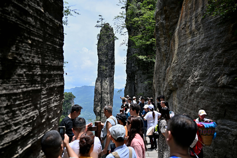 7月10日,游客在湖北恩施大峽谷景區(qū)的峰林間游玩。