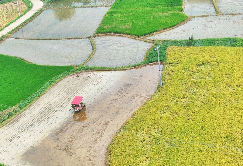 7月13日,湖南省衡陽市衡東縣霞流鎮(zhèn)農(nóng)民駕駛農(nóng)機(jī)翻耕稻田(無人機(jī)照片)。
