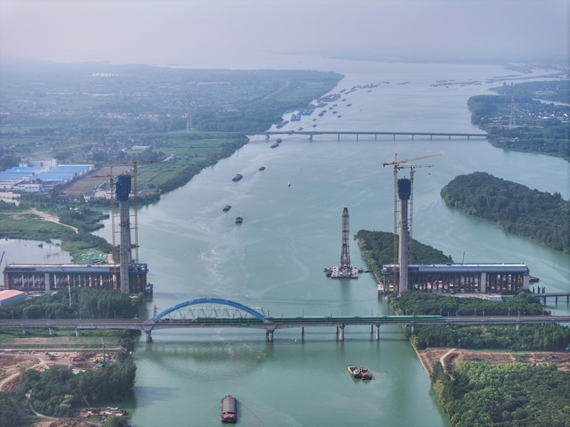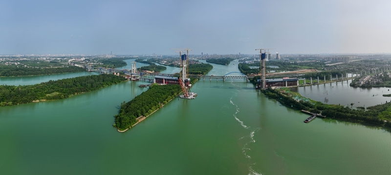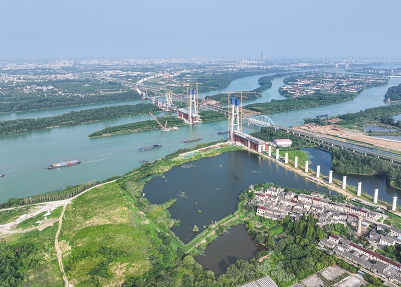 這是滬渝蓉高鐵跨京杭運河斜拉橋施工現(xiàn)場(7月13日攝,無人機(jī)照片)。