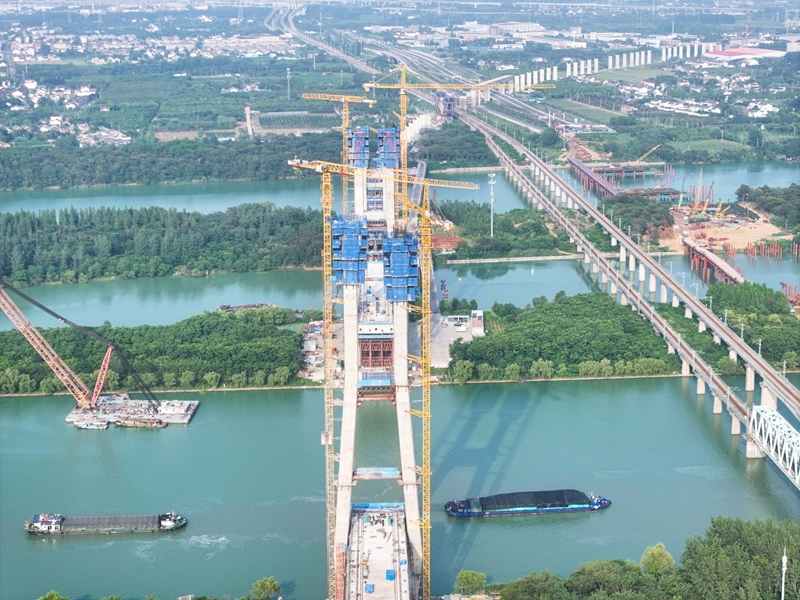 近日,由中國鐵建大橋局承建的滬渝蓉高鐵跨京杭運河斜拉橋主橋兩岸鋼混段架設(shè)順利完成,大橋主橋上部結(jié)構(gòu)施工轉(zhuǎn)入鋼梁懸臂拼裝階段,主塔建設(shè)已完成90%。據(jù)悉,該橋位于江蘇揚(yáng)州境內(nèi),是滬渝蓉高鐵全線關(guān)鍵控制性工程,橋長564.3米,主跨300米。