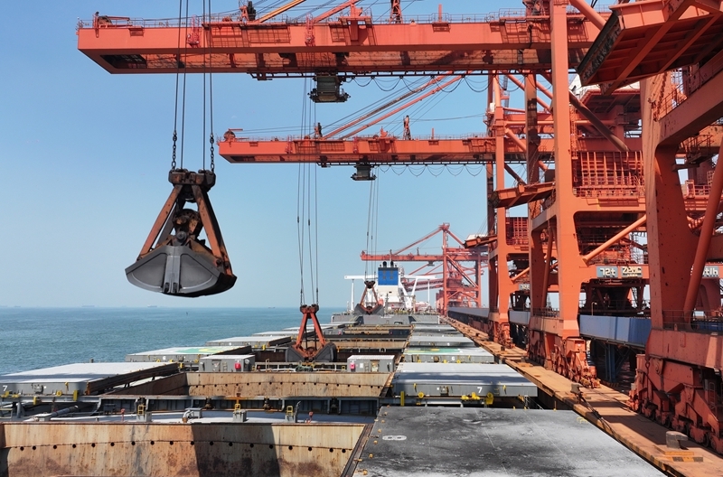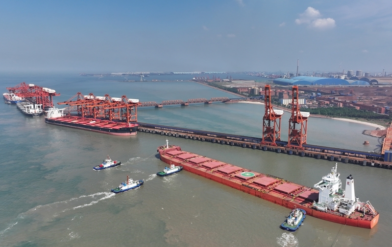 7月18日,一艘輪船靠泊在唐山港曹妃甸港區(qū)礦石碼頭卸載礦物(無人機(jī)照片)。