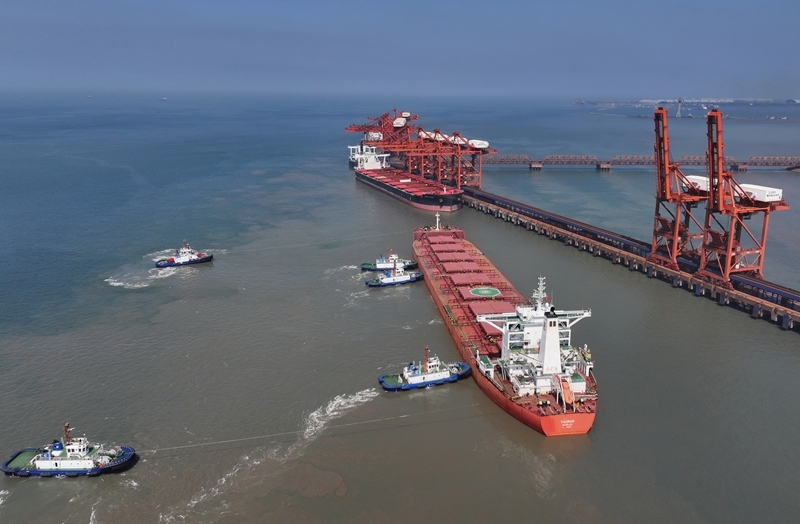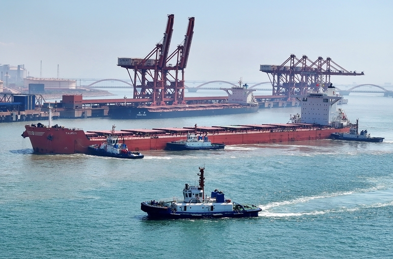 7月18日,輪船在拖輪的協(xié)助下向唐山港曹妃甸港區(qū)礦石碼頭靠泊(無人機(jī)照片)。