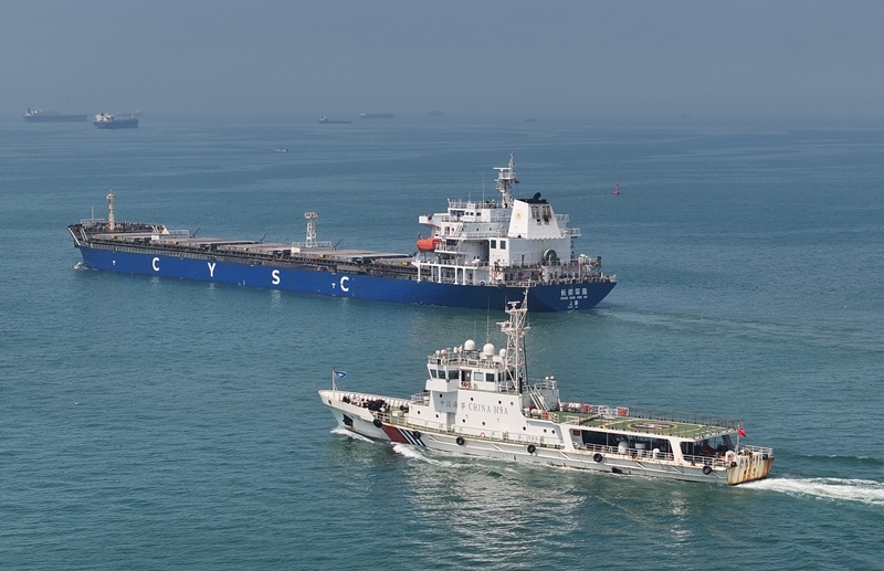 7月18日,曹妃甸海事局的巡邏船(前)在唐山港曹妃甸港區(qū)海域為進(jìn)出港輪船護(hù)航(無人機(jī)照片)。