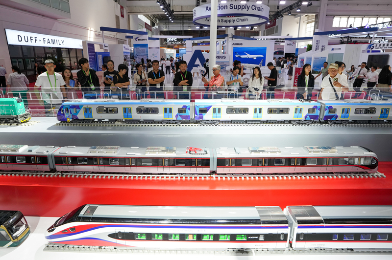 參觀者在先進(jìn)制造鏈展區(qū)中國中車展臺(tái)參觀展出的列車產(chǎn)品模型(7月16日攝)。