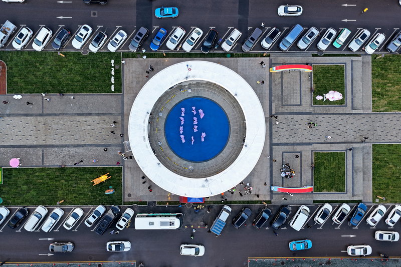 7月11日,在昭蘇縣天馬旅游街區(qū),當(dāng)?shù)匚乃嚬ぷ髡邽橛慰捅硌莞栉韫?jié)目(無人機(jī)照片)。