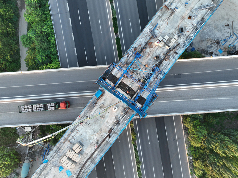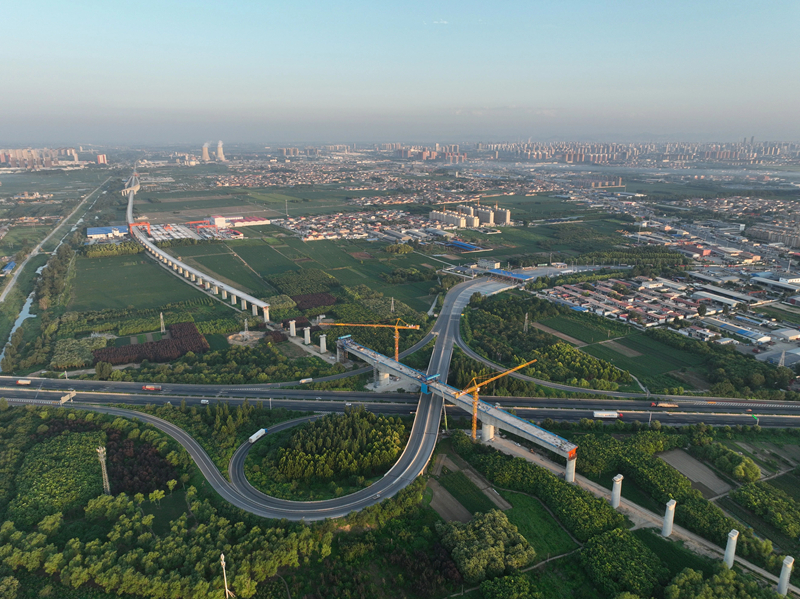 7月18日拍攝的雄忻高鐵保定東特大橋跨京港澳高速連續(xù)梁中跨施工現(xiàn)場(chǎng)(無人機(jī)照片)。