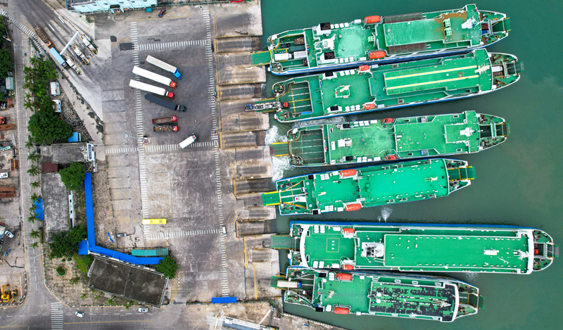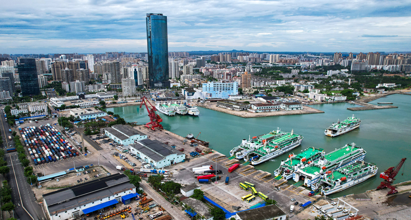 7月22日,在海口市秀英港,車輛有序駛?cè)肟蜐L船(無人機照片)。
