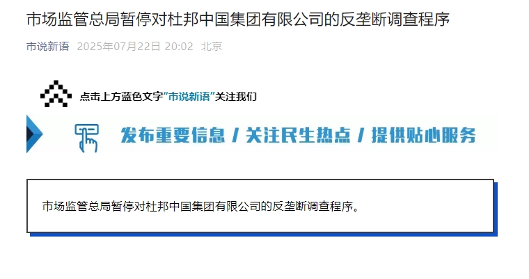 “市說新語(yǔ)”微信公眾號(hào)消息,市場(chǎng)監(jiān)管總局暫停對(duì)杜邦中國(guó)集團(tuán)有限公司的反壟斷調(diào)查程序。