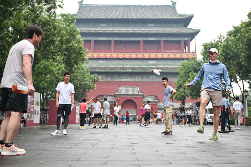 7月27日,人們?cè)诨顒?dòng)舉辦地北京鐘鼓樓廣場(chǎng)上踢毽子。