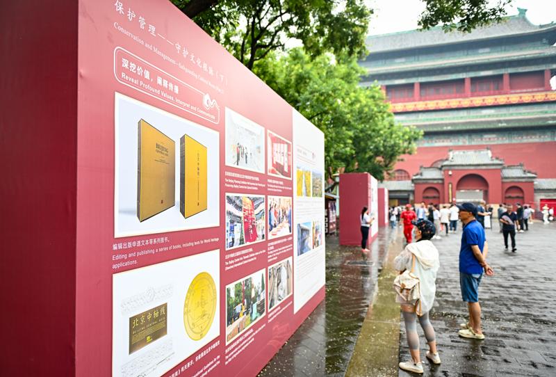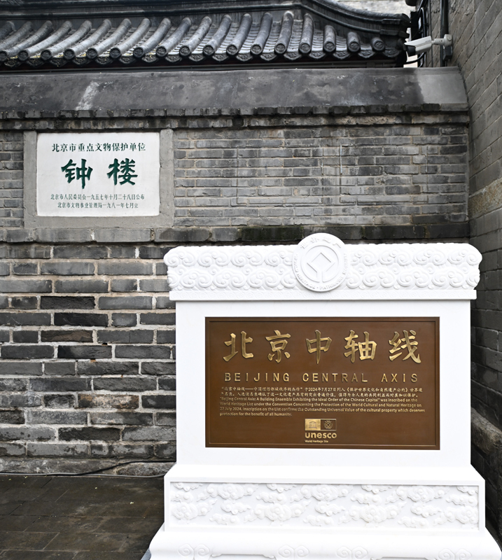 這是7月27日在北京鐘樓前拍攝的北京中軸線世界文化遺產(chǎn)標(biāo)志碑。