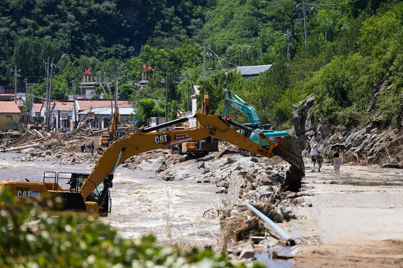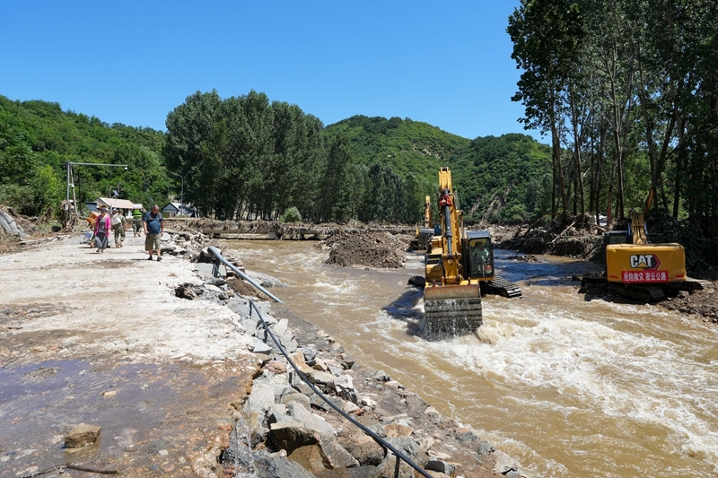 7月30日,在北京市密云區(qū)馮家峪鎮(zhèn),道路搶修人員清理河道。