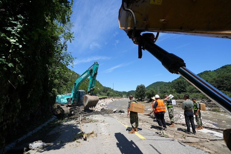 7月30日,在北京市密云區(qū)馮家峪鎮(zhèn),道路搶修人員恢復(fù)被洪水沖斷的道路。