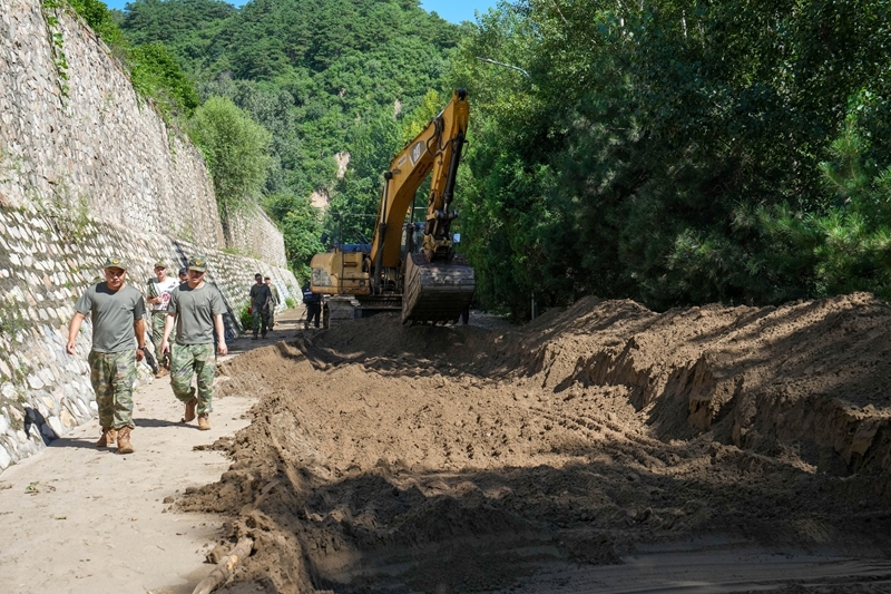 7月30日,在北京市密云區(qū)馮家峪鎮(zhèn),道路搶修人員整修道路。