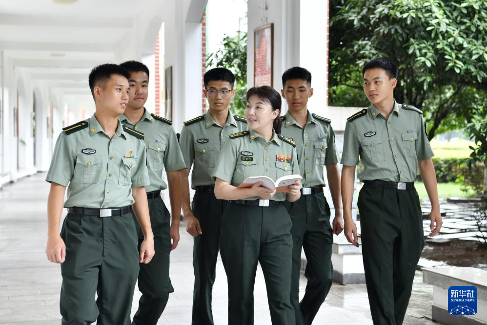 國(guó)防科技大學(xué)軍政基礎(chǔ)教育學(xué)院教授傅婉娟(左三)在課后與學(xué)員討論問題(7月22日攝)。新華社發(fā)(王驍 攝)