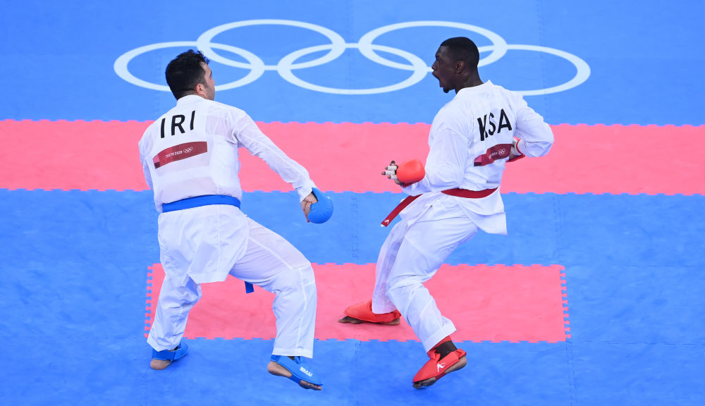 空手道作為“新增項目”之一進(jìn)入了東京奧運(yùn)會,但未能在巴黎奧運(yùn)會上繼續(xù)入圍。圖為東京奧運(yùn)會,伊朗選手薩賈德(左)與沙特選手哈米迪在空手道比賽中。黃宗治 攝