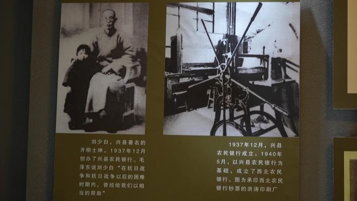 講解員張英介紹說,1937年7月7日,盧溝橋事變爆發(fā),全面抗戰(zhàn)開始,當(dāng)時八路軍120師的主力(部隊)挺進(jìn)了晉西北,創(chuàng)建了晉西北的抗日根據(jù)地?!爱?dāng)時我們這個根據(jù)地的經(jīng)濟(jì)比較繁雜,在當(dāng)時不僅有偽鈔、法幣還有銀元,以及閻錫山的晉鈔,所以為了有一個我們中國共產(chǎn)黨領(lǐng)導(dǎo)的銀行,當(dāng)時就創(chuàng)建了興縣農(nóng)民銀行。1937年12月份的時候,開明士紳劉少白專門從太原返回到興縣籌備資金,籌備了6萬銀元以及700石糧食,其中蔡家崖的開明士紳牛友蘭獻(xiàn)出了總價值2.3萬銀元、物資和150石糧食,后期還有楊家坡的楊邦漢獻(xiàn)出了價值1.5萬元的房地產(chǎn)?!睆堄⒈硎?。