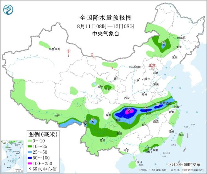 8月11日08時至12日08時,內(nèi)蒙古東南部、四川盆地東部、重慶、貴州北部和西部、湖北中西部和東北部、安徽中部、江蘇中南部以及廣東中南部、云南北部、西藏東南部等地部分地區(qū)有中到大雨,其中,安徽中部、湖北西南部、四川盆地東北部、重慶中西部和東北部等地部分地區(qū)有暴雨或大暴雨(100~150毫米)。內(nèi)蒙古西北部部分地區(qū)有4~6級風(fēng),其中,新疆東部部分地區(qū)有6~7級風(fēng)。東海大部海域、南海西南部海域?qū)⒂?~6級風(fēng)、陣風(fēng)7級。