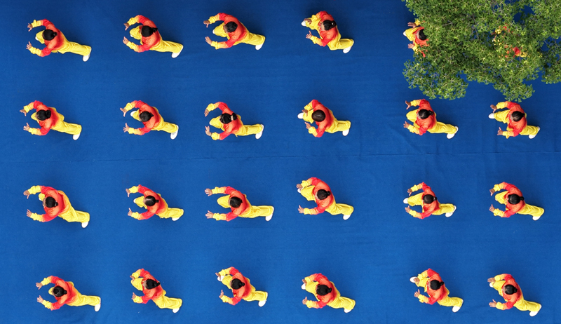 8月8日,在江蘇省揚(yáng)州市宋夾城體育休閑公園,健身愛好者練習(xí)太極拳(無(wú)人機(jī)照片)。