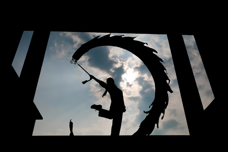8月8日,市民在河南省武陟縣全民健身館舞龍。